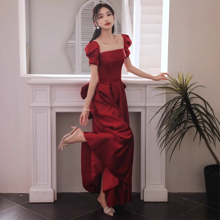 敬酒服花嫁女2025結婚敬酒宴会小柄なワインレッドドレス