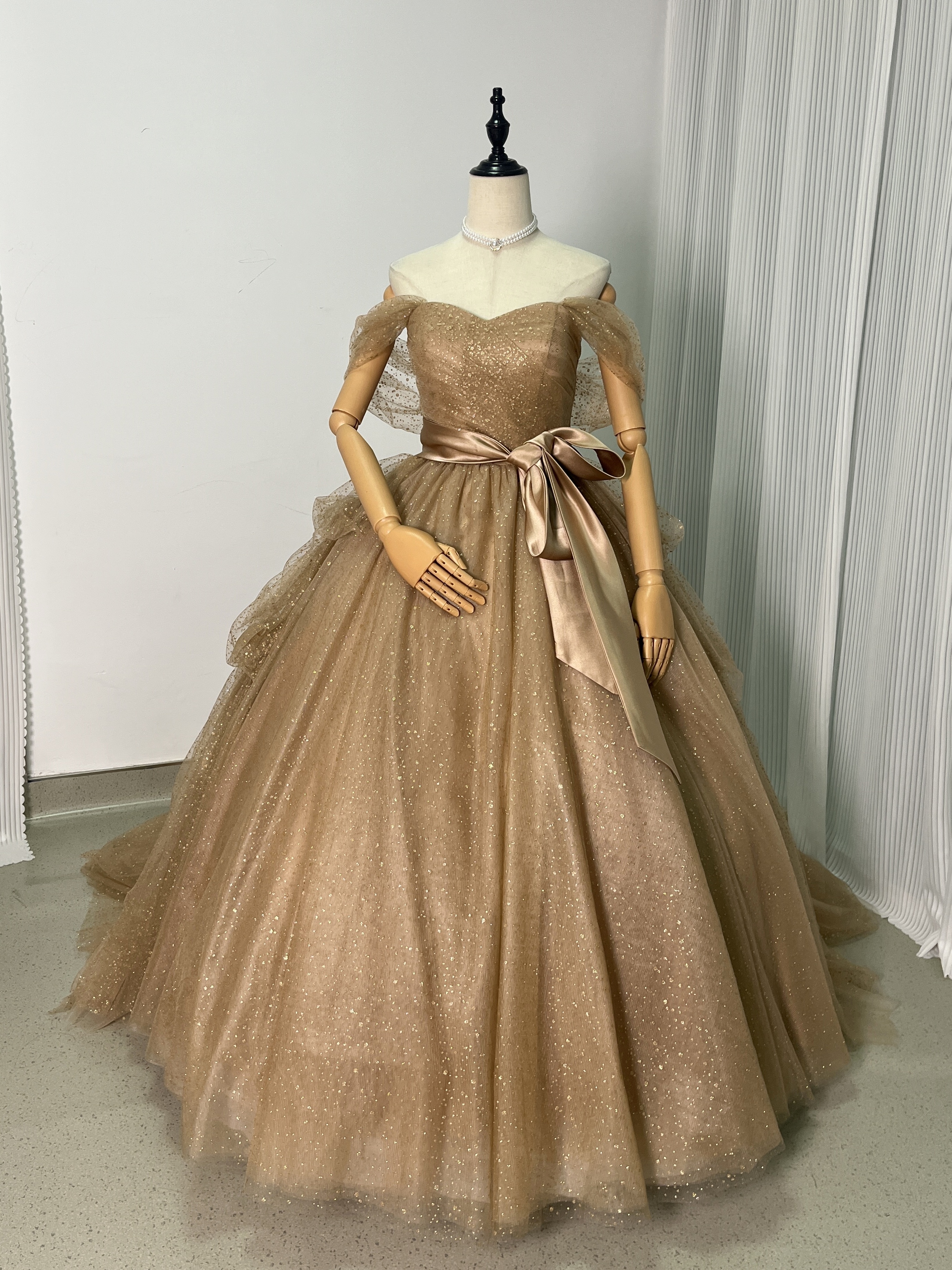 2024人気新品カラードレス シャンパン色 オフショルダー シースルー袖 ベルト キラキラチュール 編み上げ 披露宴